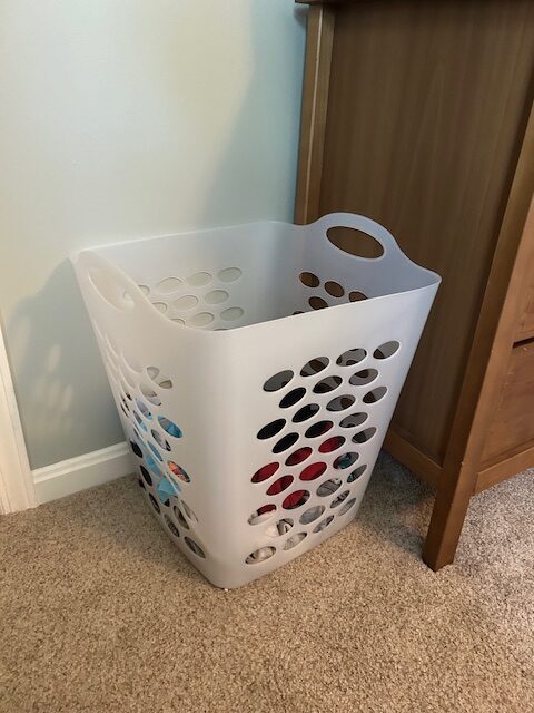 My kindergartener has two main laundry chores. First, he must deposit his dirty items into his hamper. Not on the floor, not back in his drawer, in the hamper. Second, he needs to take his hamper to the laundry room on laundry day. These laundry-related daily chores for kindergarteners are totally doable, super helpful to mom, and are the building blocks to full laundry independence in a few years. He just needs to grow a few inches.