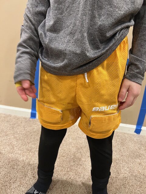 If, like me, your kid who loves hockey is a boy, he needs to wear a cup. I have found that the best cup for a kid playing hockey is actually a pair of mesh shorts with a cup built in. It’s very important that you get a few sizes of the cup shorts to try on so that your son can get the cup that’s the right fit for him. I really like the Bauer Core Mesh Hockey Jock Shorts because they have Velcro tabs to keep the socks up (more on that below). A bonus in my house is that they’re a yellowish orange color, which happens to be my son’s favorite color.
