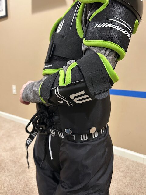 I like to take care of the elbow pads after the shoulder pads. The elbow pads tend to get lost in the bag or forgotten about, so I like to do them right after the shoulder pads in an effort to habit stack. I’m touching my kid’s arms to get the shoulder pads on so I’m going to stick with the arms and do the elbow pads next. I cannot tell you how many times I forgot the dang elbow pads at the beginning of our hockey journey. It’s a pain in the neck to have to take everything off to put the elbow pads on when you realize you missed them, so just knock them out right after the shoulder pads. These just attach to the elbows with elasticized Velcro straps.