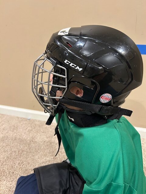 After you’ve got the skates on, you’re in the home stretch! The last pain in the neck thing you have to do to get your kid dressed for hockey is to put on the helmet. You want to make sure it’s tight to the head so it doesn’t move around a ton, but not so tight that it cuts off circulation.