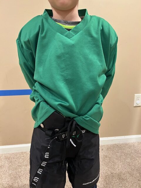 Now, your kid needs to wear a jersey over all this equipment. You probably will be given a jersey by your kid’s hockey program, so don’t worry about going out to get one. How your kid wears the jersey is a personal preference. My son likes to tuck his into his hockey pants in the front most of the time, but I let him handle that.