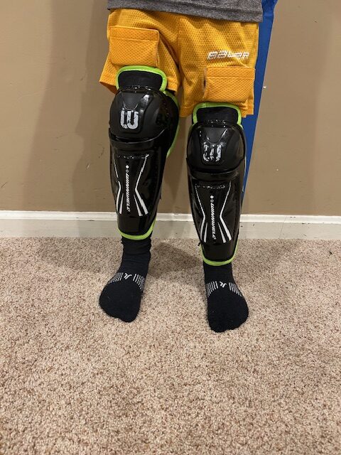 It might seem strange that the shin guards are the first actual piece of equipment to go on when you get your kid dressed for hockey, but just trust me. Please start at the shin guards! To find the right size, measure your kid’s shin from ankle to knee while he’s standing flat on the ground. Then round up to the nearest inch.