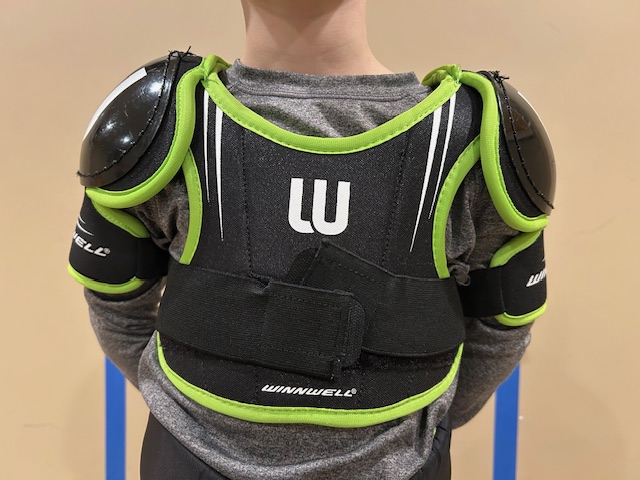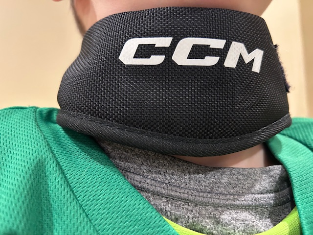 I keep moving my way up and attach the neck guard next. If your kid is new to playing hockey, don’t be surprised if they hate the neck guard. It can take some getting used to. My biggest piece of advice with respect to the neck guard is to make sure it’s not too tight or too loose. Finding the sweet spot might take a few tries, but it’s worth it. You don’t want your kid choking on the ice, but you also want the neck guard to do its job.